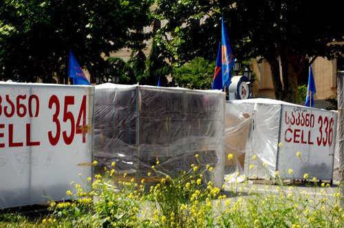 Сегодня полудня на территорию, прилегающую к Госканцелярии Грузии, ворвались около 20 человек, вооруженных дубинками, которые разрушили около 30 клеток "города камер" оппозиции. Два человека получили ранения во время последующей стычки.