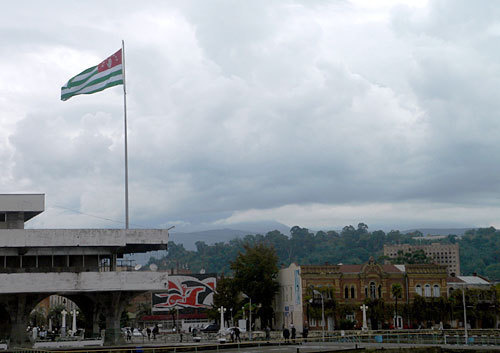 На Площади Конституции был торжественно поднят Государственный флаг Республики Абхазия размером 4 на 8 метров. Двадцатиметровый флагшток установлен на крыше морского порта.