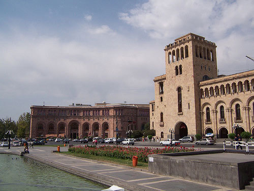 Перед зданием университета проходит акция протеста против подписания документов. Здесь собрались представители местной армянской общины с плакатами, на которых говорится "Нет - протоколам". Предполагалось, что по окончании церемонии все участники выступят с 3-минутными заявлениями.