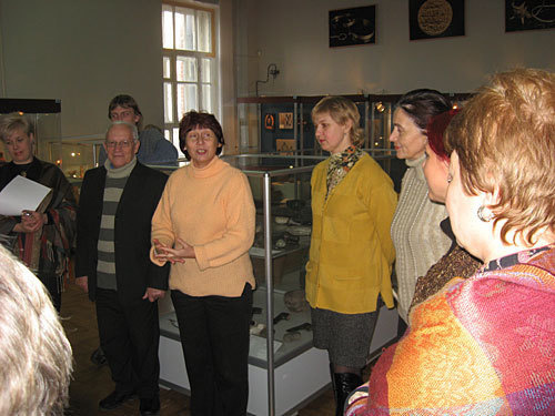 Наталья Хабарова дополнила рассказ Владислава Ивановича. Она сообщила, что экспедиция Гуренко передала в фонды музея уникальные сарматские артефакты. На музейных стендах появились длинный "всаднический" меч, два коротких меча, которыми сарматы пользовались в пешем бою. Особое внимание ученых привлекло навершие длинного меча. Оно выполнено из двух частей: призма из горного хрусталя, на которую крепился бронзовый медальон, украшенный золотом и альмандинами (редкий камень, который еще называют карбункул).