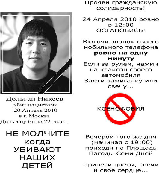 "Это не первые жертвы фашистов среди наших земляков, которые работают и учатся в Москве и других крупных российских городах. Число убитых ими наших соотечественников исчисляется десятками. Фашисты не стеснялись нападать даже на женщин. Каждый год, 20 апреля, когда фашисты празднуют день рождения Адольфа Гитлера, ни один наш соотечественник, будь то студент, рабочий, клерк, мужчина, женщина, юноша или зрелый человек, не знает, вернется ли он в этот день домой живым, - говорится в листовке, текст которой распространен на форуме Калмыкия.ру. - И каждый год этот день с завидным постоянством приносит нам черные вести - кого-то из наших соотечественников убили или покалечили - принесли в жертву тому, против которого воевали во Второй мировой войне их, фашистов, собственные деды".