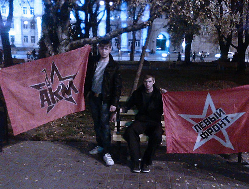 Вскоре на площадь прорвались активисты "Левого Фронта". Увидев, что к ним приближаются представители правоохранительных органов, трое из них приковали себя наручниками к лавочке, развернули флаги и стали кричать: "Долой полицейское государство!", "Долой произвол!", "Это наш город!". Потом на площадь вышла женщина с плакатом "Свободу Ходорковскому!". Еще нескольких человек, пытавшихся зайти на площадь, милиционеры перехватили и увезли на служебной машине. Кроме того, на месте событий появилось несколько мужчин в деловых костюмах и телефонами в руках.