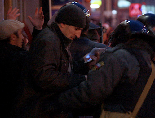 15 декабря усиленные наряды милиции проводили проверку документов и обыск подозрительных лиц в связи с появившейся в Интернете информацией о проведении несанкционированных акций в центре Москвы, в том числе в районе станции метро "Смоленская".