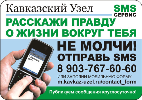 Вы стали очевидцем интересных или трагических событий, о которых должны знать обычные люди, представители общественности и власти? Расскажите о них! Тысячи пользователей Интернета с помощью sms-сервиса на "Кавказском узле" могут не только узнать о жизни на Кавказе непосредственно от Вас - жителя этого региона - но и помочь нуждающимся.