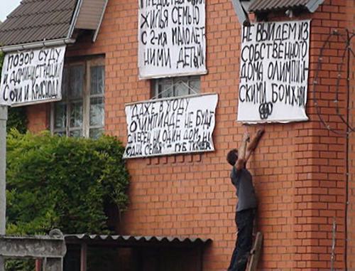 С 6 июля на фасаде дома висят плакаты, на которых написано: "Позор суду, администрации Сочи и края!"; "Не выйдем из собственного дома Олимпийскими бомжами"; "Даже в угоду Олимпиаде не будет снесен ни один дом, не пострадает ни одна семья", - губернатор Ткачев", "SOS! Выкидывают на улицу без компенсации и предоставления жилья семью с двумя малолетними детьми!"