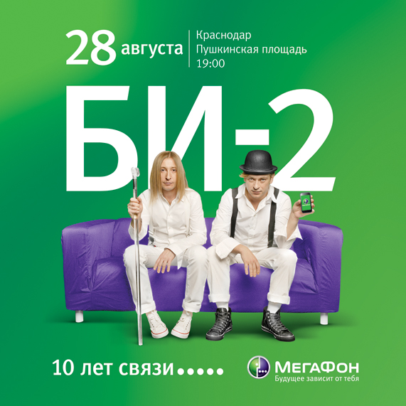 Крупнейшие города юга России - Ростов-на-Дону и Краснодар, встречают громкое событие - ключевой проект в рамках юбилея ведущего мобильного оператора страны на Северном Кавказе. Грандиозное музыкальное шоу состоится в последний уикенд лета. Впервые на центральных площадях южных столиц легендарная рок-группа «БИ-2» - хедлайнер проекта «МегаФон - 10 лет связи!», исполнит свои лучшие хиты.