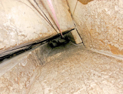 Как говорят исследователи, найденная пещера не имеет аналогов среди подобного рода комплексов - судя по всему, она рукотворна. Выходящая на вершину горы шахта - это две цельные каменные плиты, поставленные параллельно, с боковинами, заложенными аккуратными небольшими камнями. Затем идут еще несколько шахт, ведущие в огромный 36-метровый подземный зал. Одна из его стен и свод тщательно отшлифованы.