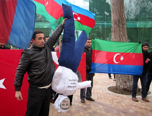 Около 100 активистов ряда общественных организаций Азербайджана провели сегодня акцию протеста около посольства Франции в Баку. Они протестовали против принятого сенатом Франции законопроекта, который предусматривает криминализацию отрицания геноцидов, признанных законами страны, в том числе и геноцида армян.