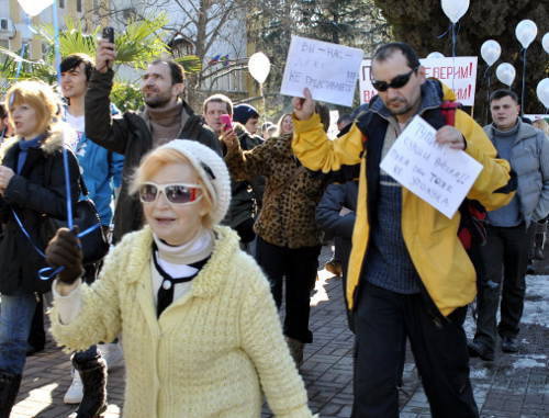 Митингующие прошли от администрации Сочи до площади ЦУМа колонной с белыми шарами и ленточками, сканируя "Россия без Путина!", "Нет ворам и жуликам!", "Долой жуликов и воров!", "Россия за честные выборы!". Участники акции держали в руках плакаты "Не верим этой власти", "Путину не верим", "Мы за честные выборы", "Долой Чурова".