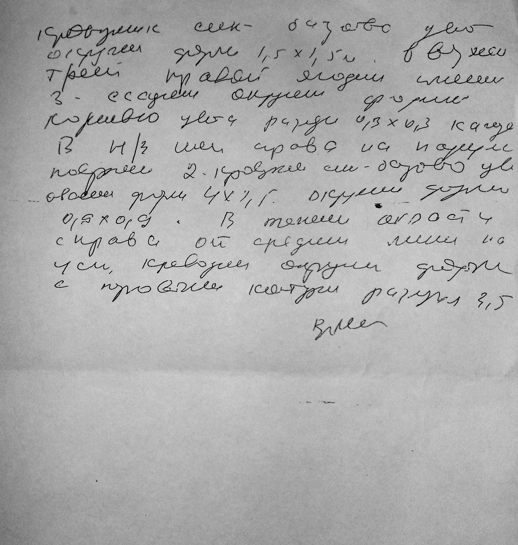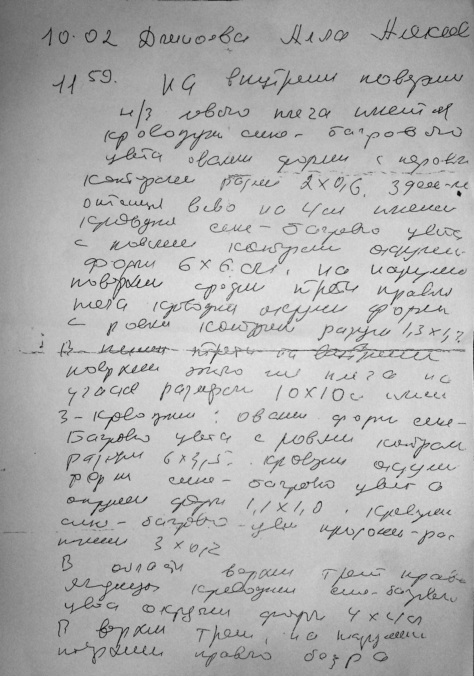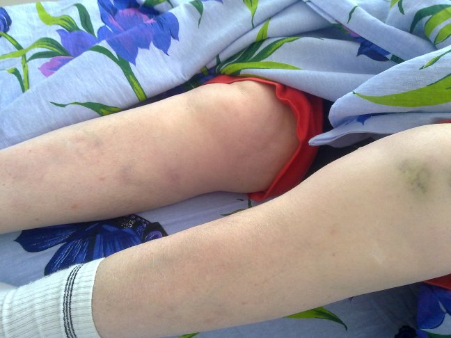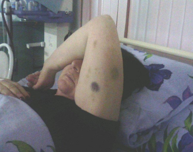 В нижней трети на внутренней поверхности этого же плеча на участке размером 10х10см имеются 3 кровоподтека: овальной формы сине-багрового цвета с ровными контурами размером 6х3,5, кровоподтек округлой формы сине-багрового цвета округлой формы 1,1,х1,0, кровоподтек сине-багрового цвета продольного расположения 3х0,2.