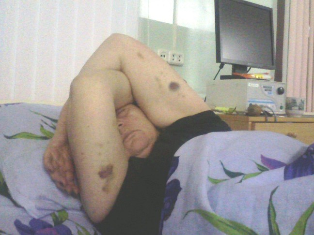 На внутренней поверхности н/3 левого плеча имеется кровоподтек сине-багрового цвета овальной формы с неровными контурами размером 2х0,6. Здесь же влево на 4см имеется кровоподтек сине-багрового цвета с ровными контурами округлой формы 6х6см. На наружной поверхности средней трети правого плеча кровоподтек округлой формы с ровными контурами размером 1,3х1,3.