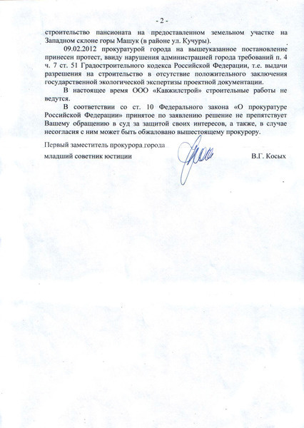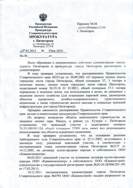 Ответ прокуратуры г. Пятигорска на заявление координатора региональной экологической организации "Солнечный патруль" по поводу вырубки зеленых насаждений на территории горы Машук