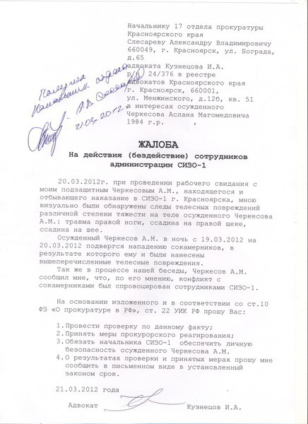 20.03.2012г. при проведении рабочего свидания с моим подзащитным Черкесовым A.M., находящегося и отбывающего наказание в СИЗО-1 г. Красноярска, мною визуально были обнаружены следы телесных повреждений различной степени тяжести на теле осужденного Черкесова A.M.: травма правой ноги, ссадина на правой щеке, ссадина на шее.