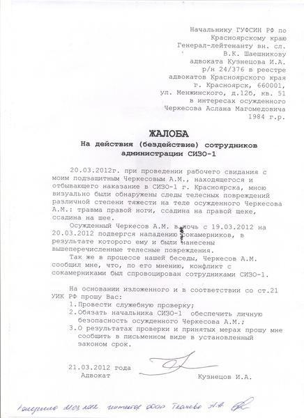 20.03.2012г. при проведении рабочего свидания с моим подзащитным Черкесовым A.M., находящегося и отбывающего наказание в СИЗО-1 г. Красноярска, мною визуально были обнаружены следы телесных повреждений различной степени тяжести на теле осужденного Черкесова A.M.: травма правой ноги, ссадина на правой щеке, ссадина на шее.