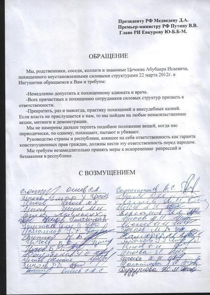 Обращение жителей Ингушетии в адрес руководителей страны и республики по факту похищения Цечоева А.И.