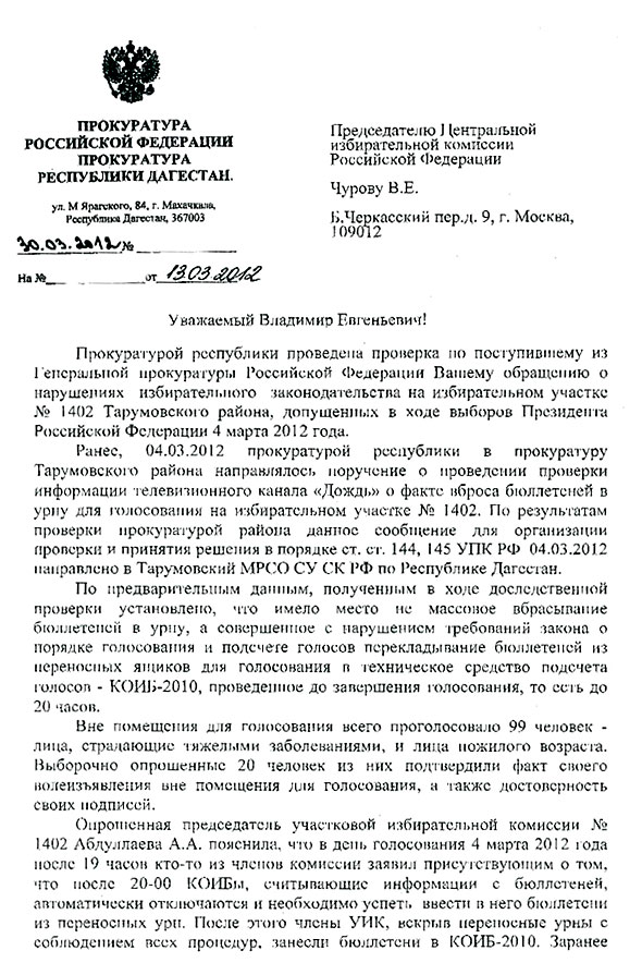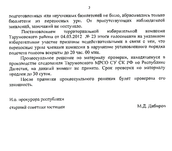 Письмо и.о. прокурора Республики Дагестан М.Д. Дибирова о проверке фактов нарушения избирательного законодательства на избирательном участке №1402 Тарумовского района 4 марта 2012 года