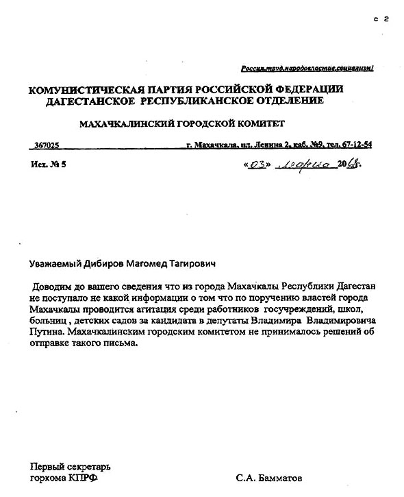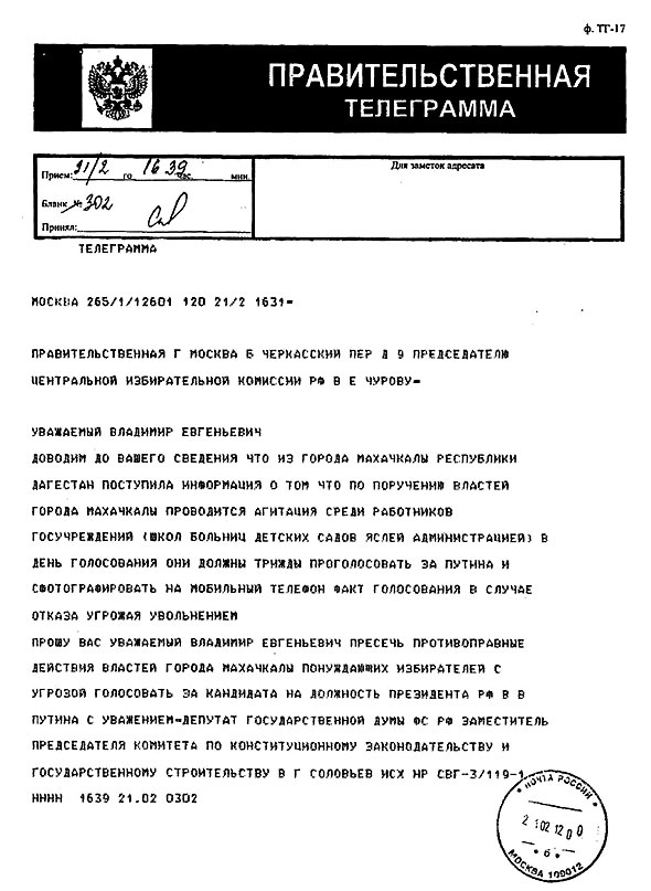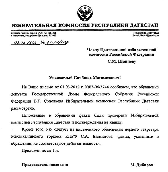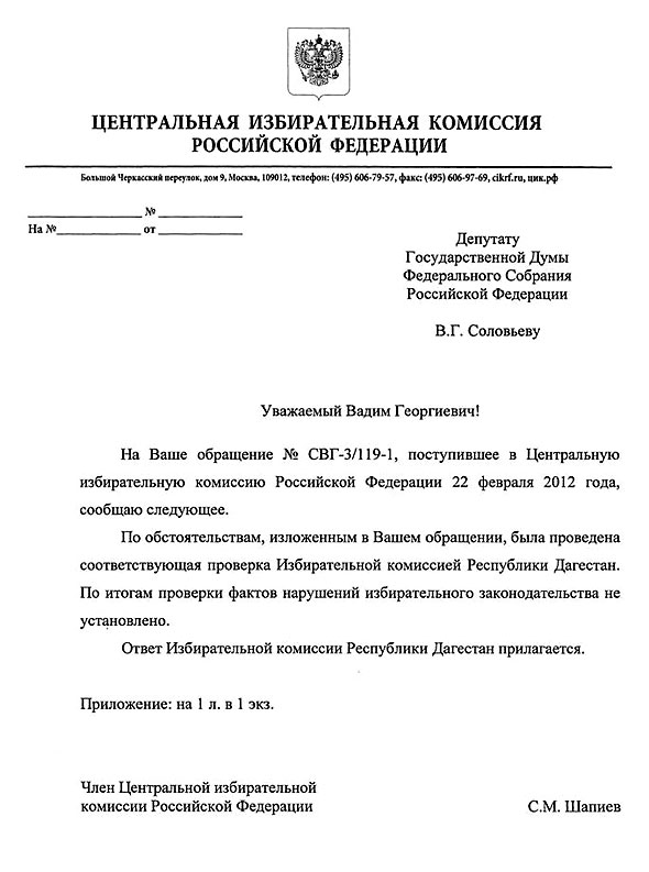 Ответ ЦИК РФ на обращение депутата Государственной Думы ФС РФ В.Г.Соловьева о якобы имевших место нарушениях избирательного законодательства в Республике Дагестан