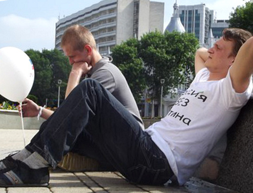 На белой футболке Дмитрия Шесточенко было написано "Россия без Путина", а Алексей Мандригеля держал в руках воздушный шар с изображением триколора и надписью "Россия". При этом за акцией наблюдали более десятка сотрудников администрации и правоохранительных органов.