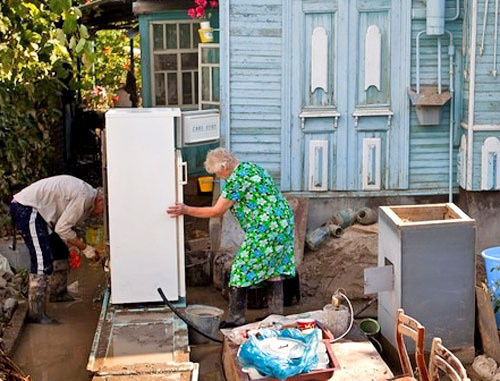 Центр помощи пострадавшим на ул. Темченко в Крымске. 5 мин назад отъехала большая машина с бытовой химией. Раздавать будут по ул. Лермонтова. Волонтеры говорят, что это уже четвертая грузовая машина за сегодня, плюс несколько "Газелей".