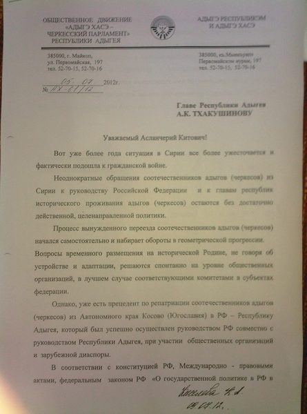 В соответствии с Конституцией РФ, международно-правовыми актами, федеральным законом РФ «О государственной политике в РФ в отношении соотечественников» и с учетом сложившейся ситуации, просим вас в кратчайшие сроки рассмотреть на заседание Государственного Совета Хасэ РА с участием главы РА и членов исполнительной власти для детального изучения ситуации, в которой оказались соотечественники адыги (черкесы) в Сирии и обратиться с конкретными предложениями к руководству РФ для принятия неотложных мер государственной поддержки переселения соотечественников адыгов (черкесов) из Сирийской Арабской Республики в Российскую Федерацию.
