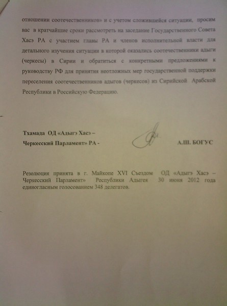 Резолюция принята в г. Майкопе ХVI Съездом ОД «Адыгэ Хасэ – Черкесский Парламент» Республики Адыгея 30 июня 2012 года единогласным голосованием 348 делегатов.