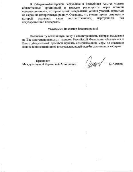 Осознавая ту величайшую ношу и ответственность, которая возложена на Вас многонациональным народом Российской Федерации, обращаемся к Вам с убедительной просьбой принять исчерпывающие меры по спасению наших соотечественников и сограждан, волей судьбы оказавшихся в Сирии.
