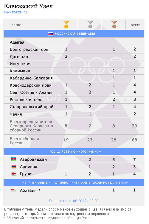 Медальный зачет регионов Кавказа на Олимпиаде - 2012. Предварительные итоги на 11 августа 2012 года