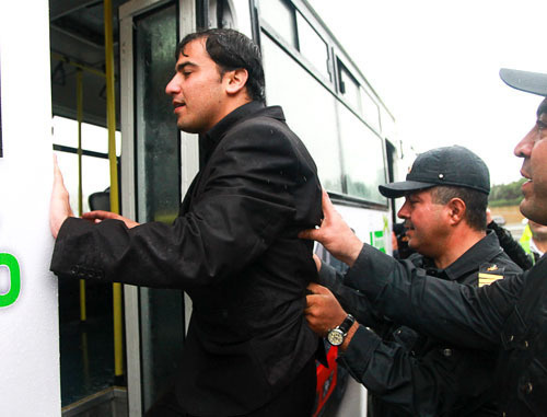 Около 12.30 мск появилась первая группа протестующих численностью примерно пять-шесть человек. Они скандировали лозунги: "Свободу!", "Свободу собраний!", "Распустить парламент". Однако сторонники оппозиции были немедленно задержаны и посажены в полицейские машины. Среди задержанных оказался глава молодежной организации Демократической партии Джамиль Гаджиев. Та же участь постигла еще одну группу активистов примерно в таком же количестве, появившуюся на площадке перед парламентом спустя 10 минут.