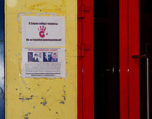 Одна из листовок с текстом "В Сирии гибнут черкесы, не оставайтесь равнодушными!" была наклеена в Нальчике у входа в офис Международной черкесской организации, еще две листовки были размещены на зданиях в других районах города.