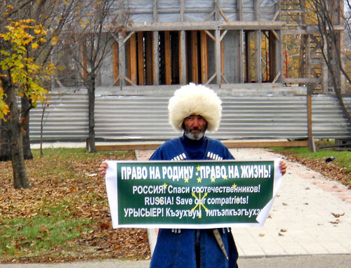 Сегодня с 12.00 до 14.00 у здания Госфилармонии Республики Адыгея одиночный пикет провел член движения "Адыгэ Хасэ – Черкесский парламент" Сергей Коблев. Он держал плакат с надписью на русском, английском и черкесском языках "Россия, спаси соотечественников!".