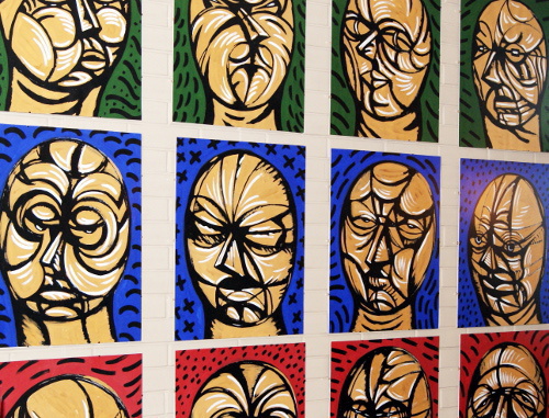 На выставке в "Умляуте" представлены работы из трех проектов Тимура Мусаева-Кагана "Черная серия", "Мутации", а также "Пантеон", выполненный в цветах дагестанского триколора - синем, красном и зеленом, и названный Георгием Ереминым своеобразным манифестом проекта.