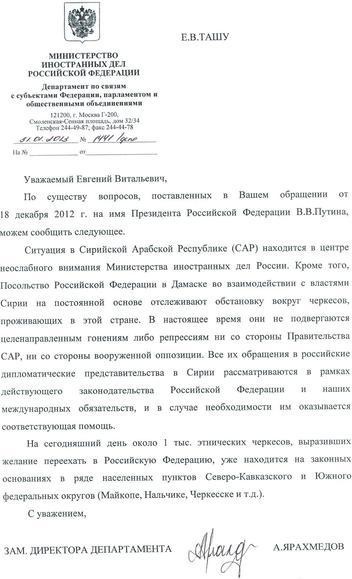 Ответ МИД РФ на обращение Совета Черкесских общественных организаций России Президенту РФ В. Путину