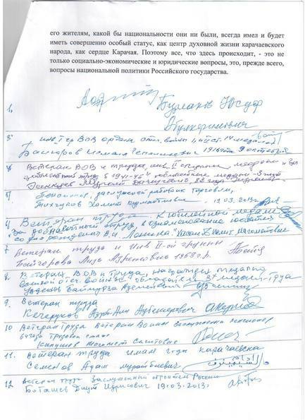 Мы, подписавшиеся под обращением, требуем от федерального и республиканского руководства с уважением отнестись к мнению большинства жителей округа, избравших Мэра для защиты своих интересов. И еще раз напоминаем о том, что Карачаевск, который одинаково дорог всем его жителям, какой бы национальности они ни были, всегда имел и будет иметь совершенно особый статус, как центр духовной жизни карачаевского народа, как сердце Карачая. Поэтому все, что здесь происходит, - это не только социально-экономические и юридические вопросы, это, прежде всего, вопросы национальной политики Российского государства.