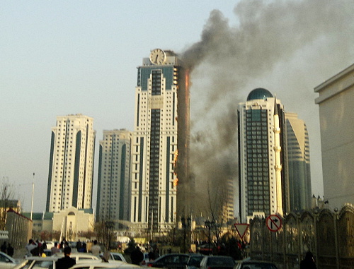 По одной из версий, причиной возникновения пожара в самом крупном здании высотного комплекса "Грозный-Сити" могло послужить замыкание электропроводки.
