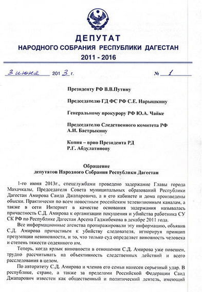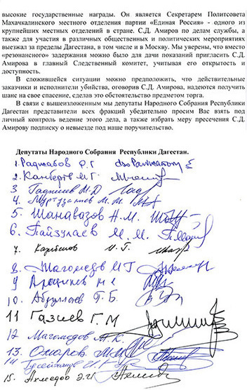 В связи с вышеизложенным, мы, депутаты Народного Собрания, представители всех фракций, убедительно просим Вас взят под личный контроль ведение этого дела, а также избрать меру пресечения С.Д. Амирову подписку о невыезде под наше поручительство.