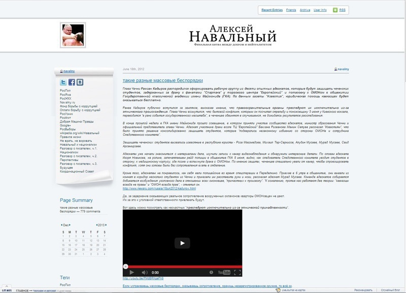 Самый цитируемый СМИ в 2013 году российский блогер оппозиционер Алексей Навальный в два раза опередил занявшего второе место Рамзана Кадырова в рейтинге, составленном по итогам исследования компании "Медиалогия". В десятку самых цитируемых блогеров России вошел также губернатор Кубани Александр Ткачев.
