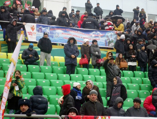 Часть зрителей составили студенты, отправленные на стадион своими учебными заведениями "в добровольно-принудительном" порядке. Об этом стало известно посредством сообщения, поступившего сегодня на смс-сервиса "Кавказского узла". "Студентов загнали сюда с 8 утра, и под дождем до сих пор стоят и ждут. Никто уйти не может, грозятся выговорами. Огонь, видимо, важнее здоровья молодежи", – написал читатель, не подписавшись.