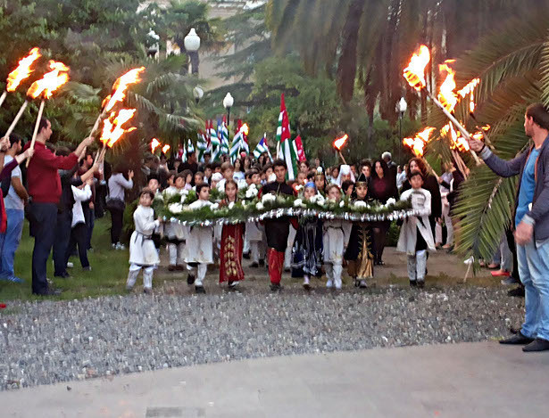 Молодежь в национальной одежде с гирляндами из живых цветов и абхазскими флагами прошла от площади Свободы к набережной, где установлен памятник жертвам войны. Здесь их ожидала другая группа молодых людей с горящими факелами, образуя светящийся коридор к морю. Положив вокруг памятника гирлянды, другая группа ребят спустилась к морю и опустила в воду венки с зажженными свечами. В конце акции ее участники разожгли огромный костер на берегу моря и молча встали вокруг него с горящими свечами.