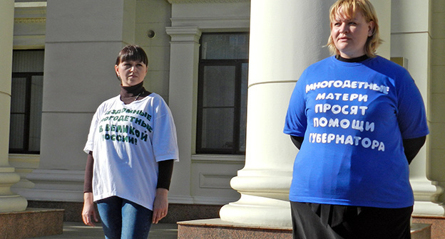 Ольга Ещенко и Надежда Киреева стояли на ступеньках у здания правительства Волгоградской области в футболках с надписями "Многодетные матери просят помощи губернатора" и "Бездомные многодетные в великой России". Женщины стояли на ступеньках с 13 до 15 часов.