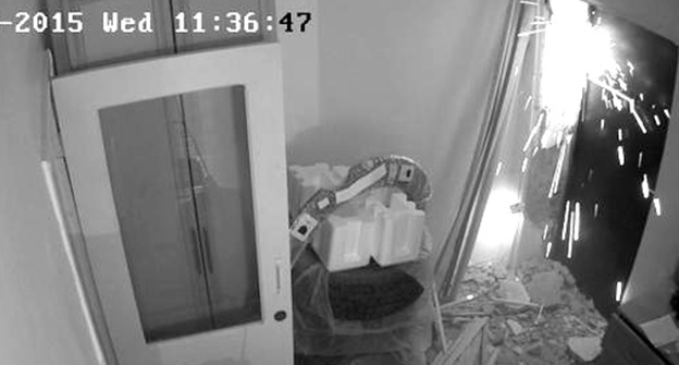 Сейчас неизвестные болгаркой вскрывают дверь в квартиру СМГ, находящуюся на одной площадке с офисом. Сам офис уже разгромлен. Также молодые люди в масках разгромили автомобиль.