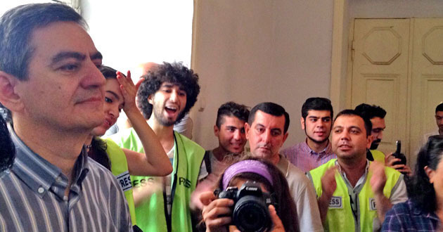 Возмущенные действиями судебных приставов, журналисты и активисты в знак протеста в течение пяти минут хлопали в ладоши в коридоре суда, после этого они стали скандировать "Хадиджа!".