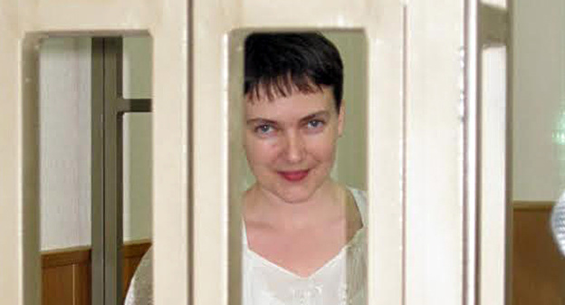 Заседание по делу Надежды Савченко 1 октября началось без ее адвоката Марка Фейгина – он вылетел в Москву для участия в другом судебном процессе. Надежда Савченко стояла в стеклянной клетке-аквариуме в новом красном свитере.