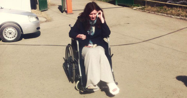 "На судебной мед.экспертизе выяснилось, что у меня отслоение кости на левой ступне. Ребята практически носят меня на руках (коляску забрали в больнице)", - написала Александрина Елагина на своей странице в Facebook в 15:47 мск, выложив фото, на которой она запечатлена сидящей в инвалидной коляске.