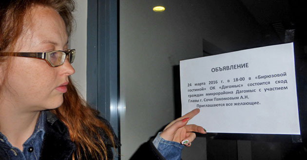 24 марта с 18.00 до 19.30 в здании оздоровительного комплекса "Дагомыс" проходило мероприятие с участием Пахомова. Оно анонсировалось как "сход граждан" - соответствующее объявление с приглашением всех желающих было вывешено в оздоровительном комплексе, сообщила корреспонденту "Кавказского узла" секретарь совета ТОС "Дагомыс" Екатерина Шурманова.