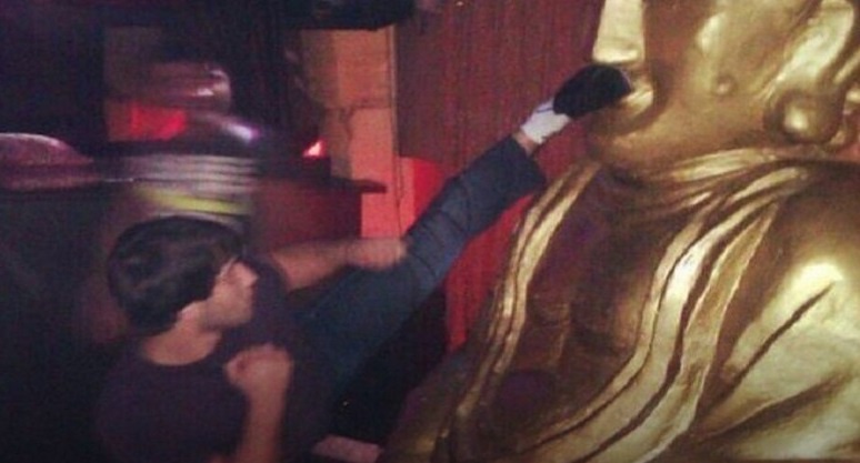Спортсмены из Дагестана, прогуливаясь по Элисте 1 апреля, зашли в буддийский храм, где один из них справил нужду, а также ударил ногой статую Будды, передает "Дождь", отмечая, что, возможно, об инциденте никто и не узнал бы, если бы сами спортсмены не транслировали свои действия в приложение Periscope. Кадры, выложенные в Интернет, увидели жители Элисты и приехали разбираться с борцами в гостиницу, где остановилась команда. Драки удалось чудом избежать, однако дагестанцу пришлось на коленях просить разгневанных буддистов о прощении, передает телеканал. Примечательно, что в сети, в том числе и на площадке YouTube, размещены видео о событиях, последовавших за инцидентом в храме. В них транслируются лишь фото, как парень делает растяжку ногой к носу Будды.