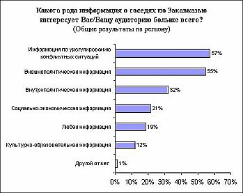 В Армении, Азербайджане и Грузии, судя по утверждениям журналистов, интерес к той или иной информаци о соседних странах разный. Так, если из всей поступающей информации о зарубежных странах в Армении и Азербайджане наблюдается больший интерес к событиям в соседних по Закавказью государствах, то в Грузии к такой информации в основном относятся как к информации о России, других странах СНГ. 68% журналистов из Армении и 40% из Азербайджана (максимальные показатели) подчеркивают, что в их странах информация о соседях по региону интересует в первую очередь. С точки же зрения 60% опрошенных из Грузии, в их стране сообщения и материалы о России, других странах СНГ вызывают не меньший по сравнению с информацией об Армении и Азербайджане интерес. Это несколько и подтверждается результатами другого вопроса, касающегося интереса самих опрошенных журналистов к различного рода информациям о соседних странах. Если из всех видов поступающей о соседних странах информации внимание армянских и азербайджанских журналистов в первую очередь занимает информация о проблемах урегулирования конфликтных ситуаций в регионе (так ответили 64% опрошенных из Армении и 84% из Азербайджана), то грузинских журналистов, пишущих о странах региона, больше интересует информация внешнеполитического характера. Такое признание сделали 56% журналистов из Грузии.