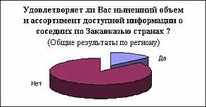 - По солидарному утверждению опять же очевидного большинства опрошенных журналистов региона, нынешний уровень обмена информацией - неудовлетворительный. Трудности в получении эксклюзивных материалов скорее связаны не столько с подверженностью самих журналистов распространенным в своих странах стереотипам о соседях, сколько с техническим обеспечением контактов с деятелями Закавказья. На фоне довольно высокого уровня интереса к информации о странах Южного Кавказа, такие проблемы, как "невозможность прямых контактов" и "большие расходы на интервью по телефону" кажутся преодолимыми.