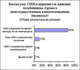 Журналистам и СМИ региона значительная часть опрошенных отводят важную, но не главную роль. Так ответили 84% из 75 журналистов. 12% считают, что роль журналистов и СМИ в строительстве межгосударственных отношений в Закавказье ничтожна. Всего 2 журналиста (представители Азербайджана) отводят медиа региона основную роль.