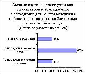 Несмотря на приведенную выше картину, свидетельствующую о сравнительно высокой степени интереса к информации о соседних странах, по солидарному признанию подавляющего большинства всех опрошенных журналистов, нынешний объем доступной информации неудовлетворителен. Так ответили по 80% журналистов из Армении и Азербайджана и все опрошенные из Грузии. 5 армянских и столько же азербайджанских журналистов удовлетворяет нынешний уровень доступа к информации о соседях.