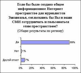 67 из 75 журналистов ответили однозначно положительно на вопрос "Если бы было создано общее информационное Интернет пространство для журналистов Закавказья, согласились бы Вы и ваши СМИ сотрудничать и пользоваться этим пространством?". Чаще всего свое согласие журналисты обьясняли следующими формулировками: "Никогда не стоит отказываться от еще одного источника информации", "Это может способствовать увеличению потока объективной информации", "Общее пространство послужит поддержанию контактов между журналистами трех стран" и т.д. Однозначный отказ в сотрудничестве заявил всего 1 журналист (из Азербайджана), мотивируя это следующей формулировкой: "Зачем обмениваться информацией с врагами". 5 журналистов из Армении и Грузии своими ответами оставили вопрос открытым, подписав следующее: "Все зависит от условий сотрудничества и пользования", "Может быть" и т.д.